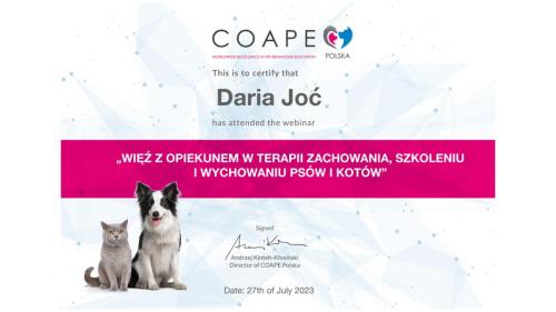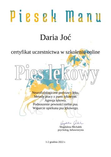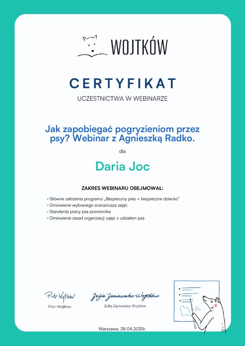 Jestem behawiorystką oraz trenerką psów. Moim celem jest pomoc opiekunom w budowaniu silnej, opartej na zaufaniu relacji z psem – takiej, która sprawia, że codzienne życie staje się łatwiejsze i pełne radości. Do każdej konsultacji podchodzę indywidualnie, dopasowując plan pracy do potrzeb psa i oczekiwań jego opiekuna. Konsultacje prowadzę w Świdniku, Lublinie i okolicach.